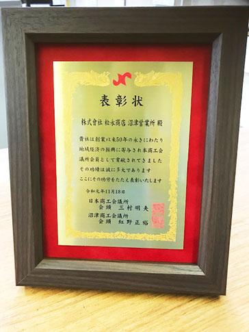 沼津商工会議所から㈱松永商店 沼津営業所(旧㈱大幸として)が創業50周年として表彰されました。